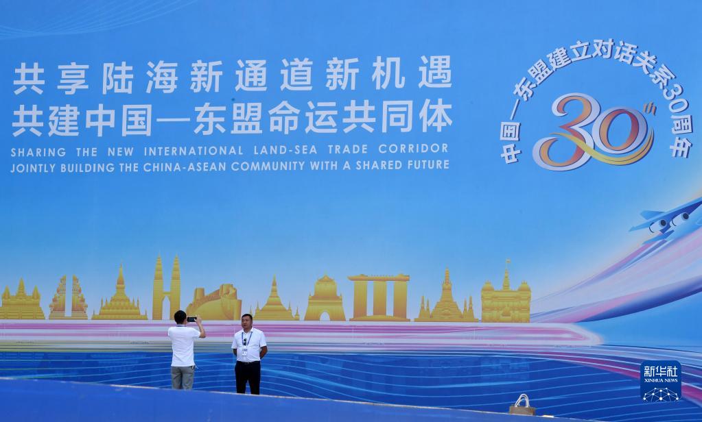 9月10日,参会者在中国-东盟建立对话关系30周年标识下留影。第18届中国-东盟博览会在广西南宁开幕。