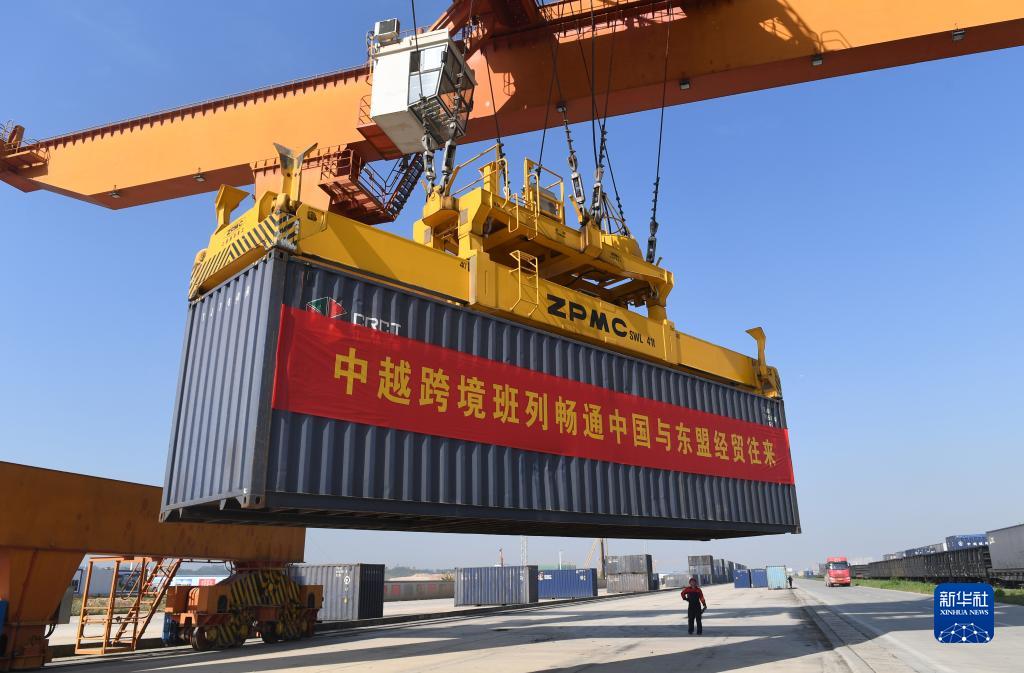 在广西南宁国际铁路港,工人在吊装中越跨境班列货物集装箱(2020年11月11日摄)。