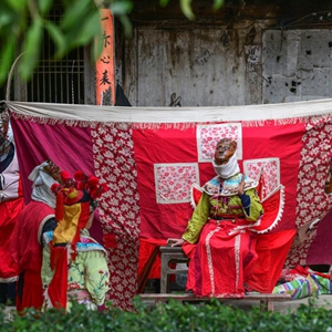 1月8日,在重庆酉阳县铜鼓镇清泉村,当地村民组织面具阳戏演出,迎接新年到来。