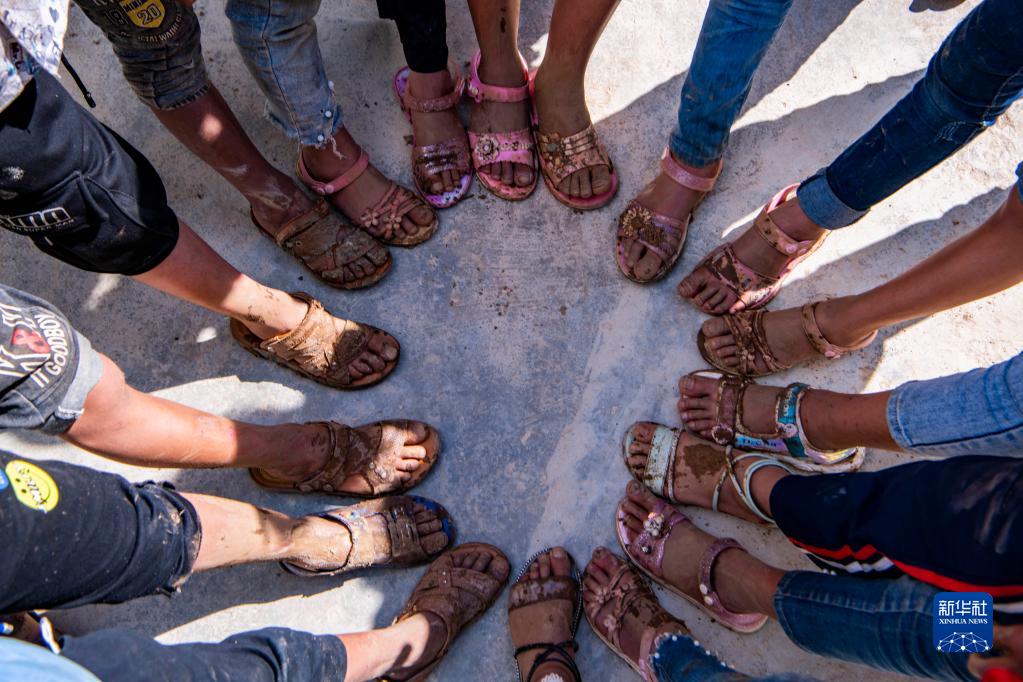 劳动归来的哈卜吗村小学的孩子们双脚沾满泥土(9月8日摄)。