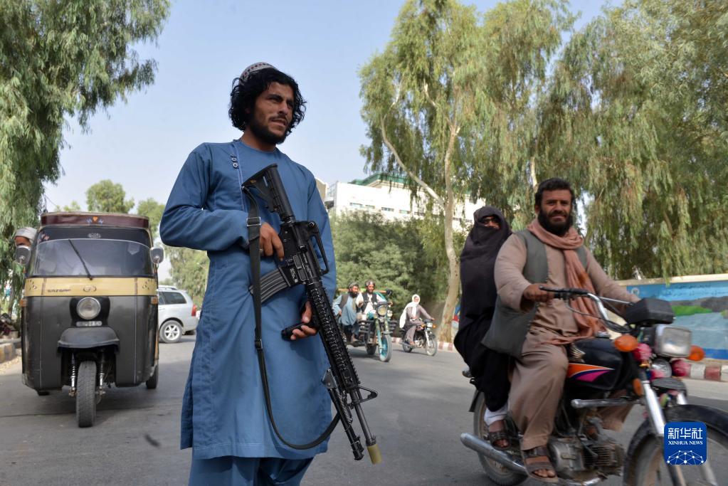 9月11日,塔利班成员在阿富汗坎大哈的一处检查点执勤。