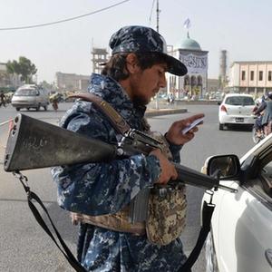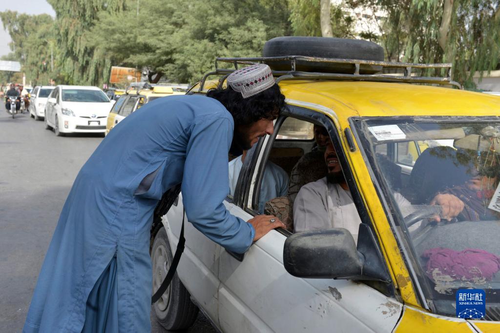 9月11日,在阿富汗坎大哈的一处检查点,塔利班成员与一名驾驶员交谈。