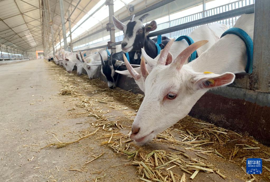 9月11日,奶羊在内蒙古一家公司的牧场羊舍里进食。