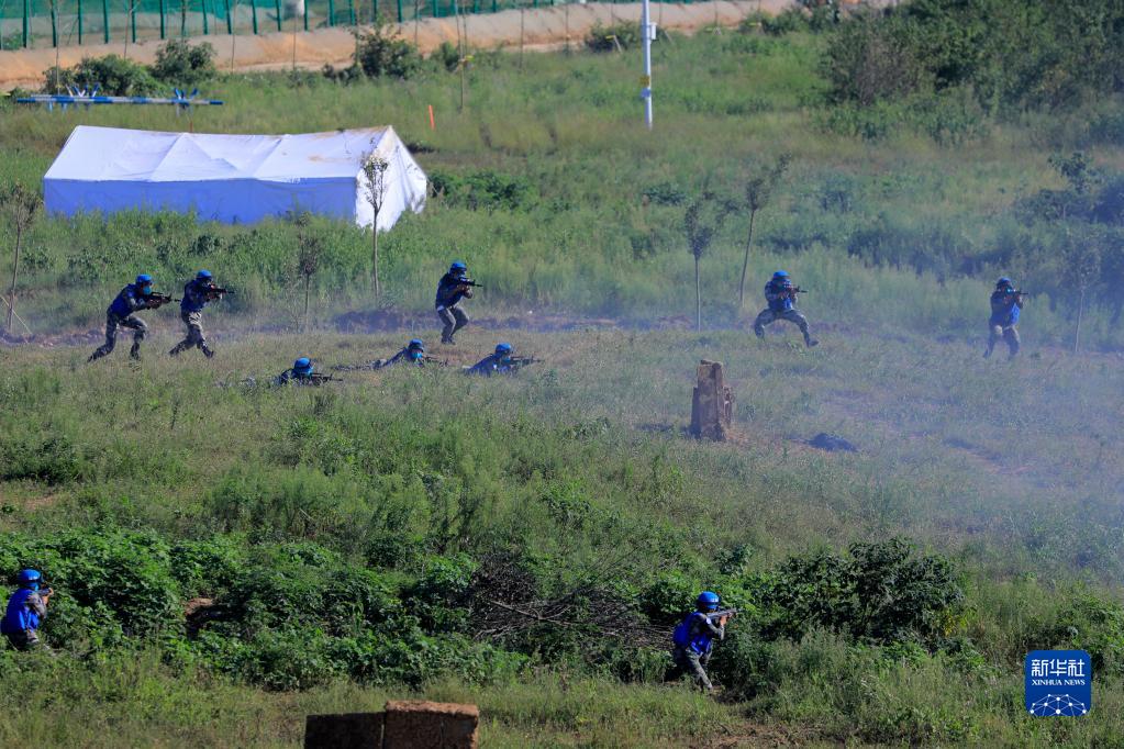 9月11日是“共同命运-2021”国际维和实兵演习专业分训阶段的最后一天,15时始,中国、蒙古国、巴基斯坦、泰国等国参演官兵,在陆军确山某训练基地维和训练营地进行了训练观摩交流。新华社记者 刘芳 摄