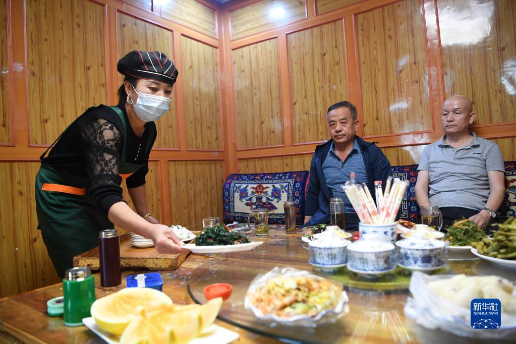 甘肃甘南卓尼县木耳镇力赛村村民李日占草(左)在自家的农家乐里为客人上菜(9月11日摄)。