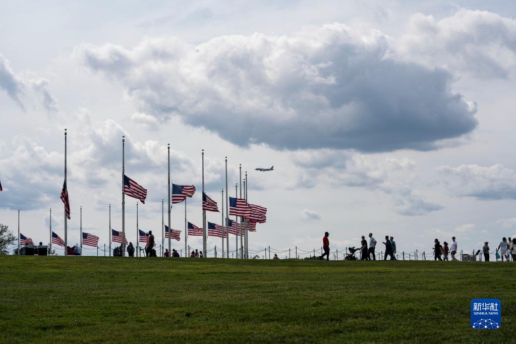 9月11日,美国华盛顿纪念碑周围的美国国旗降半旗,纪念“9·11”恐怖袭击事件二十周年。