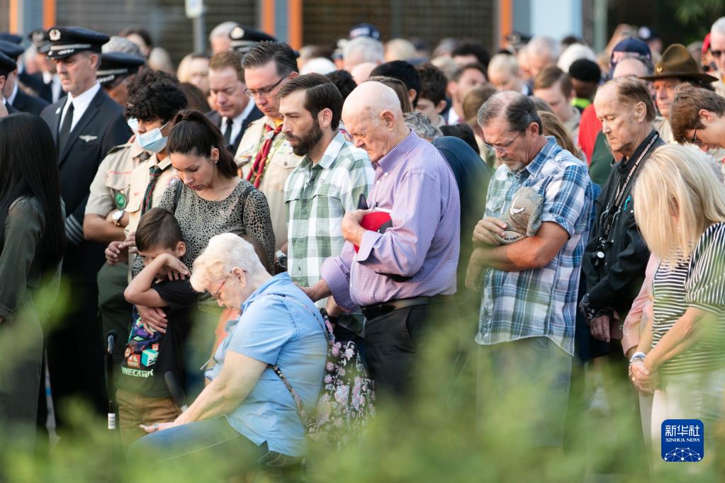 9月11日,在美国得克萨斯州格雷普韦恩市的“9·11”纪念广场,民众为“9·11”恐怖袭击事件遇难者默哀。