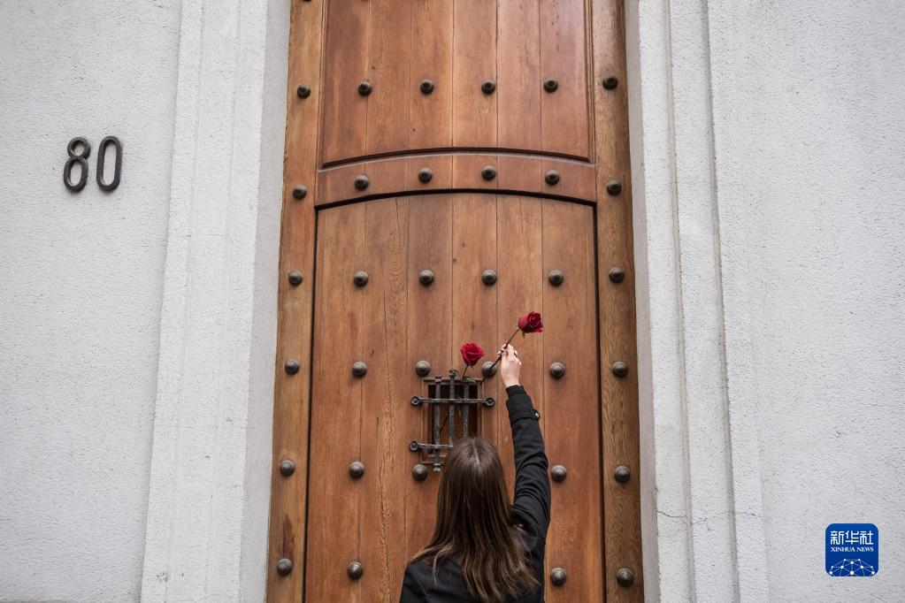9月11日,在智利首都圣地亚哥,一名妇女在总统府莫内达宫位于莫兰德街80号的侧门处献上鲜花,寄托对前总统阿连德的哀思。