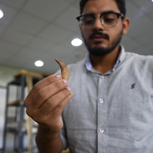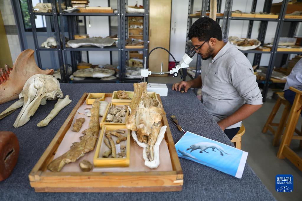 9月4日,在埃及达卡利亚省曼苏拉大学脊椎动物古生物学研究中心,研究员阿卜杜拉·古哈尔用显微镜观察半水生鲸化石。