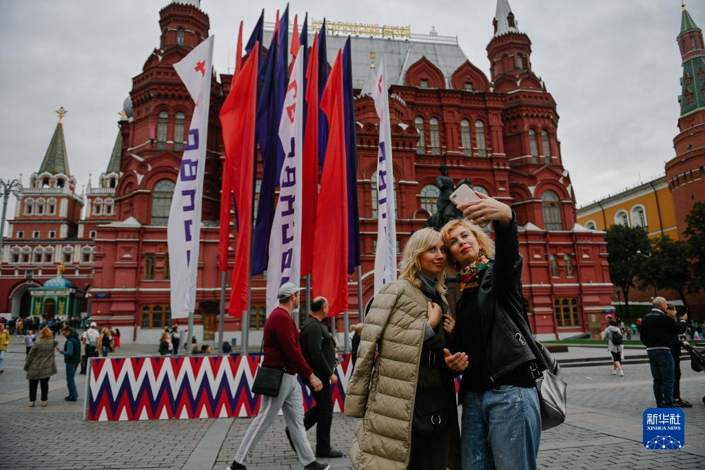 9月11日,人们在俄罗斯首都莫斯科的城市日旗帜前留影。