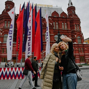 9月11日,在俄罗斯首都莫斯科,人们经过城市日旗帜。