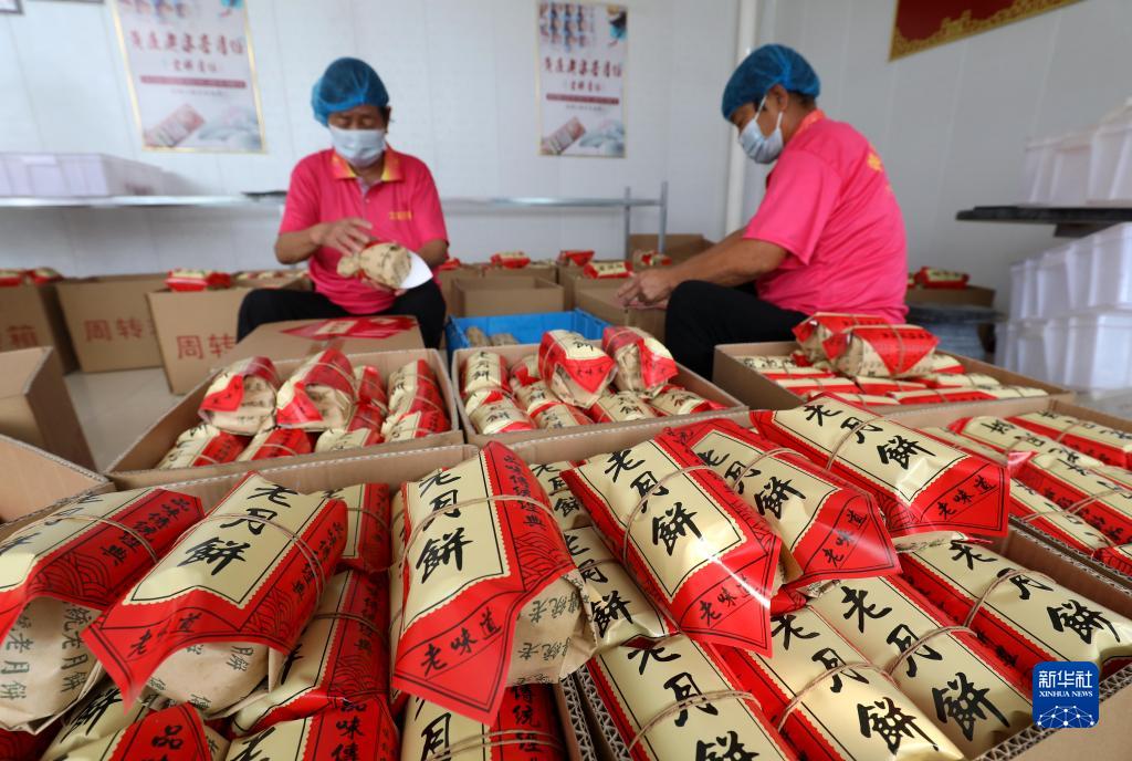 9月12日,在河北省石家庄市藁城区九门回族乡黄庄村一家月饼生产手工坊,工人在包装手工月饼。