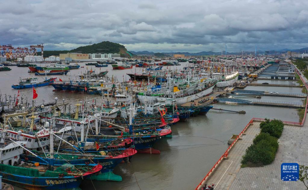 随着台风“灿都”逼近,浙江舟山众多渔船靠港避风。