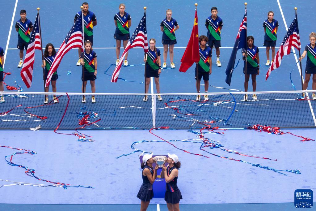 9月12日,张帅(前左)/斯托瑟(前右)在颁奖仪式上亲吻奖杯。新华社发(郭克摄)