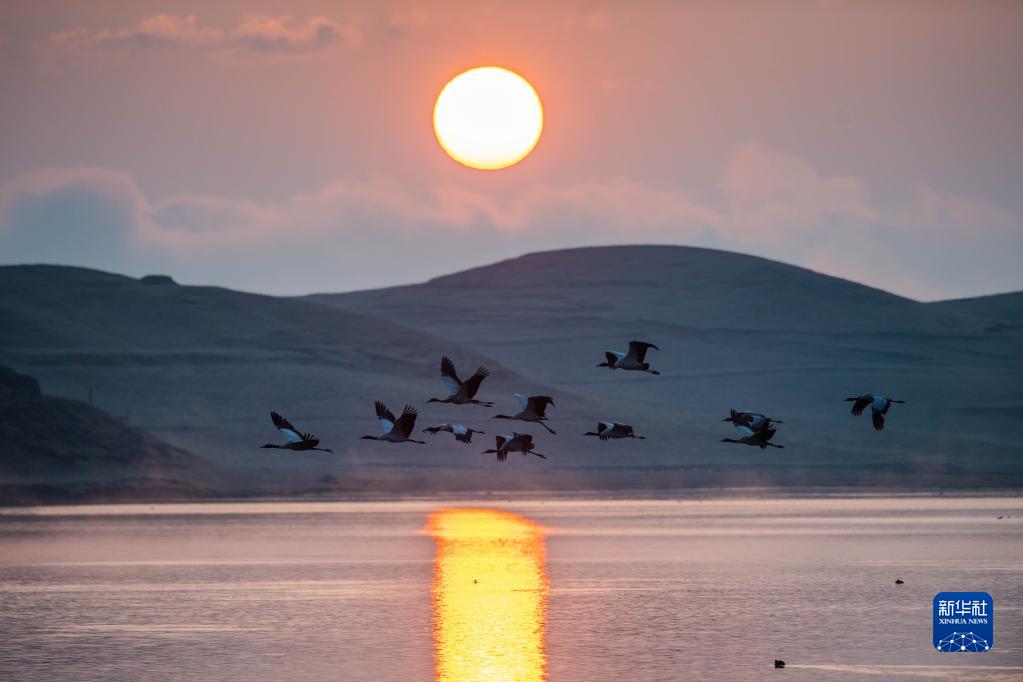 日出时分,黑颈鹤在云南省昭通市大山包黑颈鹤国家级自然保护区飞翔(2月25日摄)。新华社记者 胡超 摄
