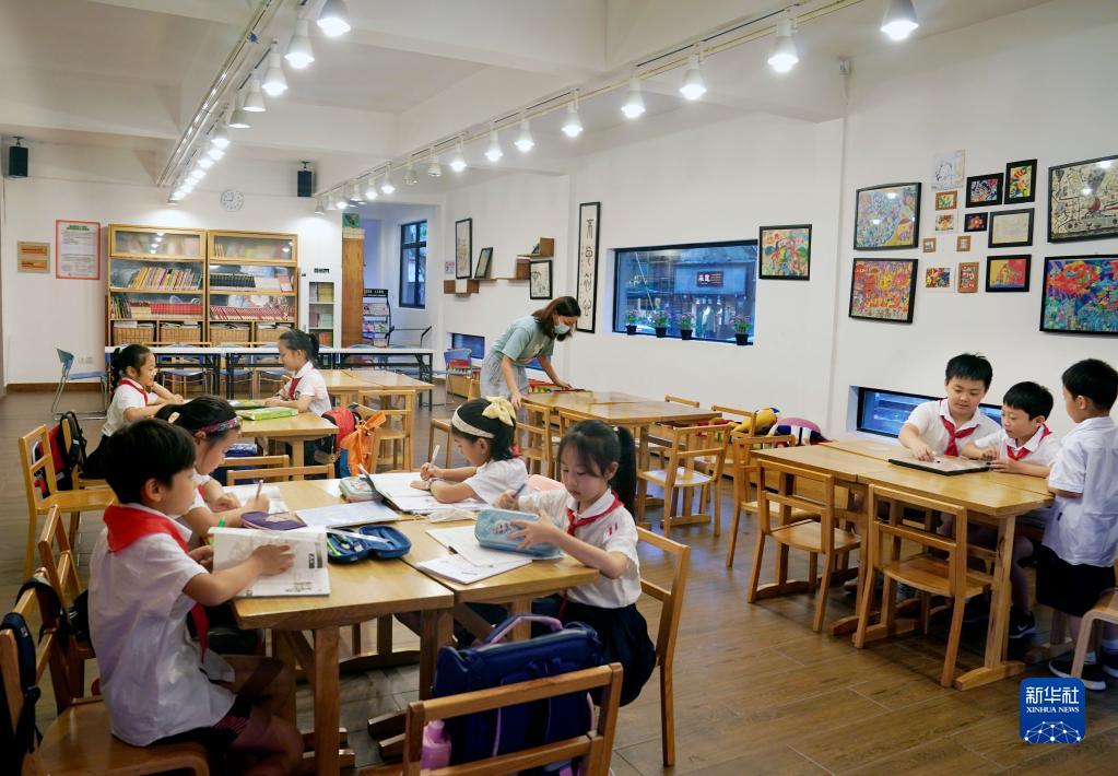 9月13日,在上海市黄浦区巨鹿路第一小学,中午家长有接送困难的学生,被集中在图书阅览室,在老师的看护下写作业、阅读、玩益智棋类。