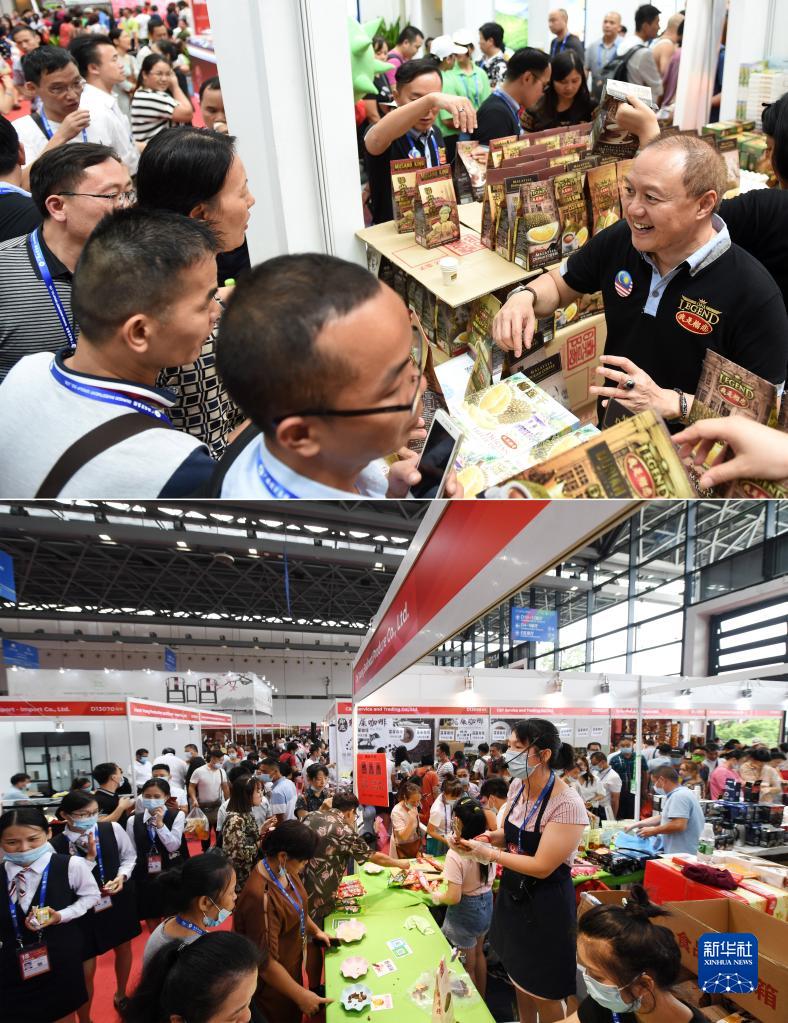 拼版照片:上图为2016年9月12日,在第13届中国—东盟博览会上,观众在选购马来西亚的商品;下图为2021年9月13日,在第18届中国—东盟博览会上,参展商在推介越南食品。 新华社记者陆波岸摄