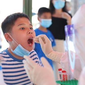 9月14日,在厦门市思明区筼筜街道金桥社区检测点,医务人员为小朋友进行核酸检测采样。