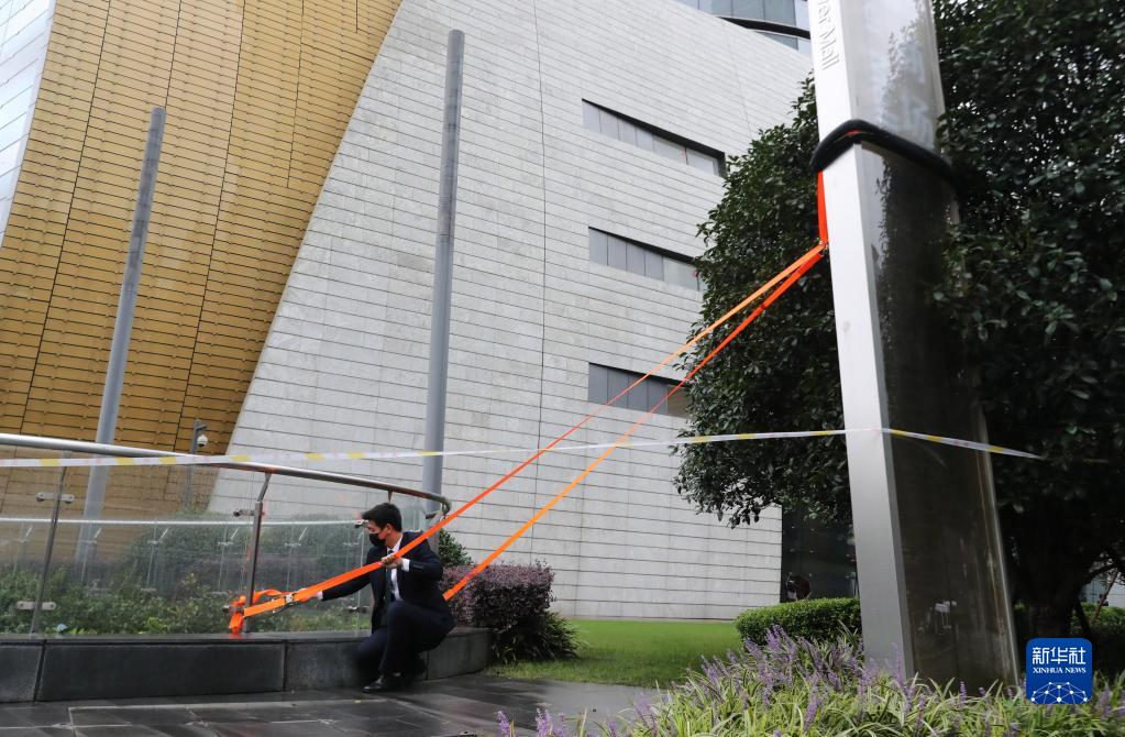 9月13日,工作人员使用绑带固定上海中心大厦周边广告牌。