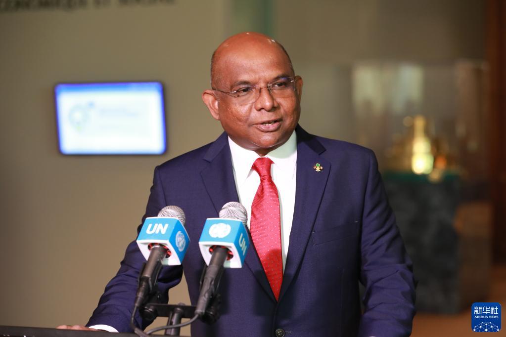 9月14日,在位于纽约的联合国总部,第76届联合国大会主席阿卜杜拉·沙希德在第76届联大第一次全会后的记者会上讲话。