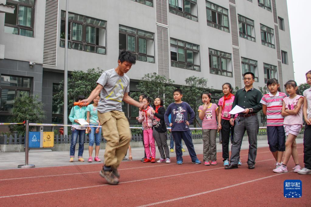 这是王红旭老师在重庆市大渡口区育才小学为学生示范跳绳(2014年5月15日摄)。