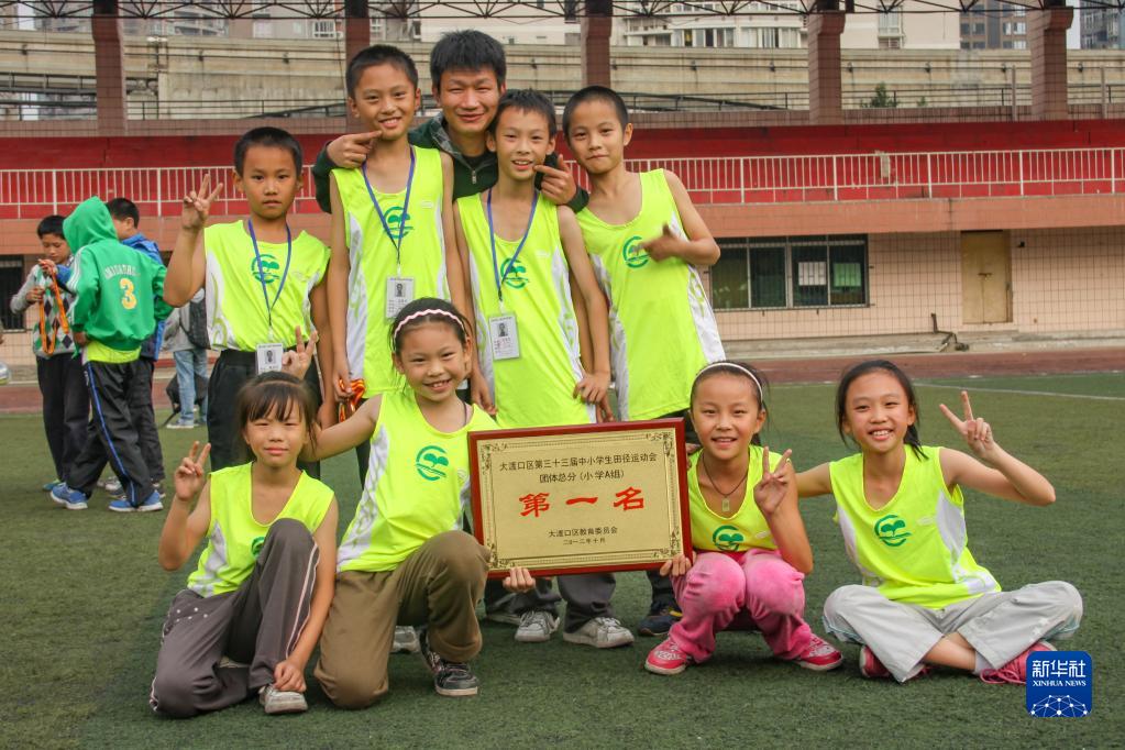 这是王红旭老师在重庆大渡口区中小学生田径运动会上和学生合影(2012年10月26日摄)。