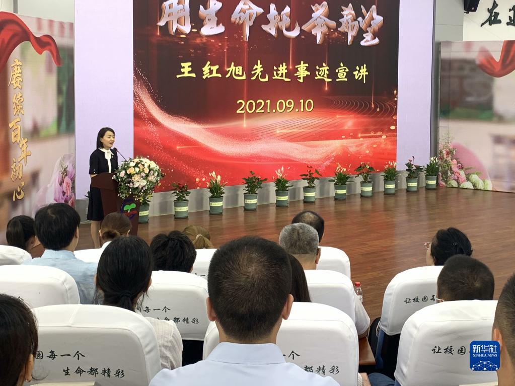 9月10日,在育才小学举行的大渡口区教师节表彰活动上,育才小学教师胡伶俐作王红旭先进事迹宣讲报告。