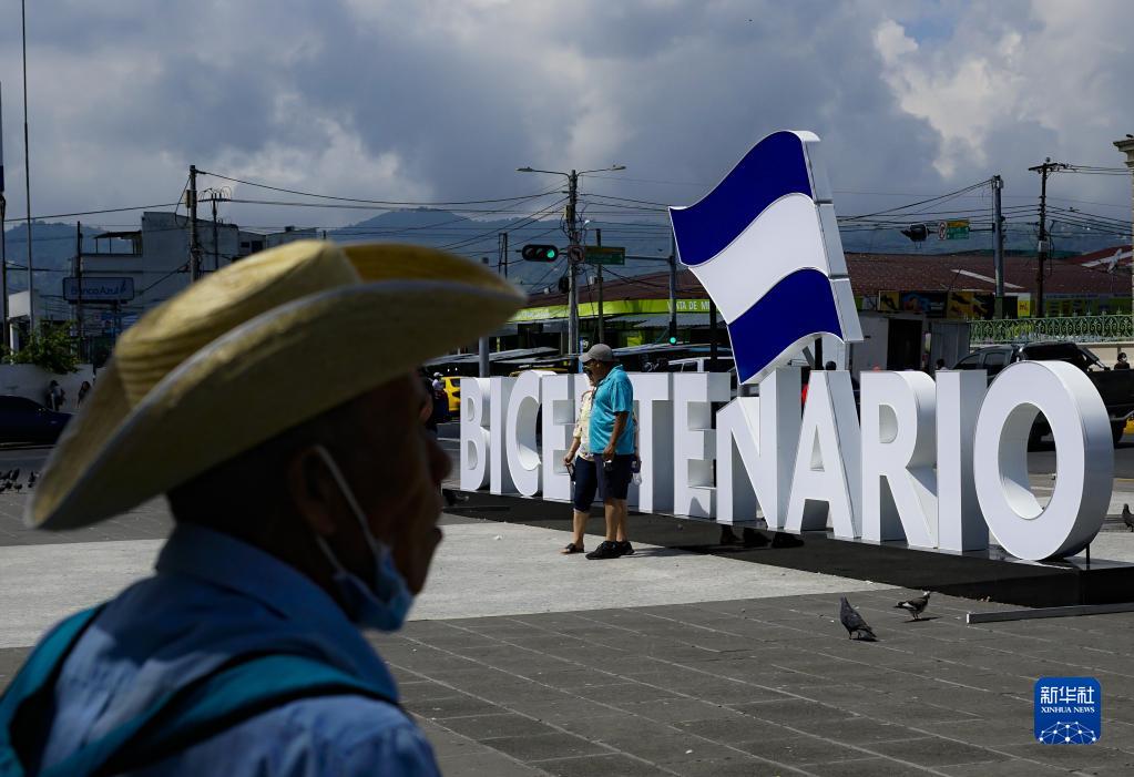 9月14日,在萨尔瓦多首都圣萨尔瓦多,人们在独立200周年纪念牌前合影留念。