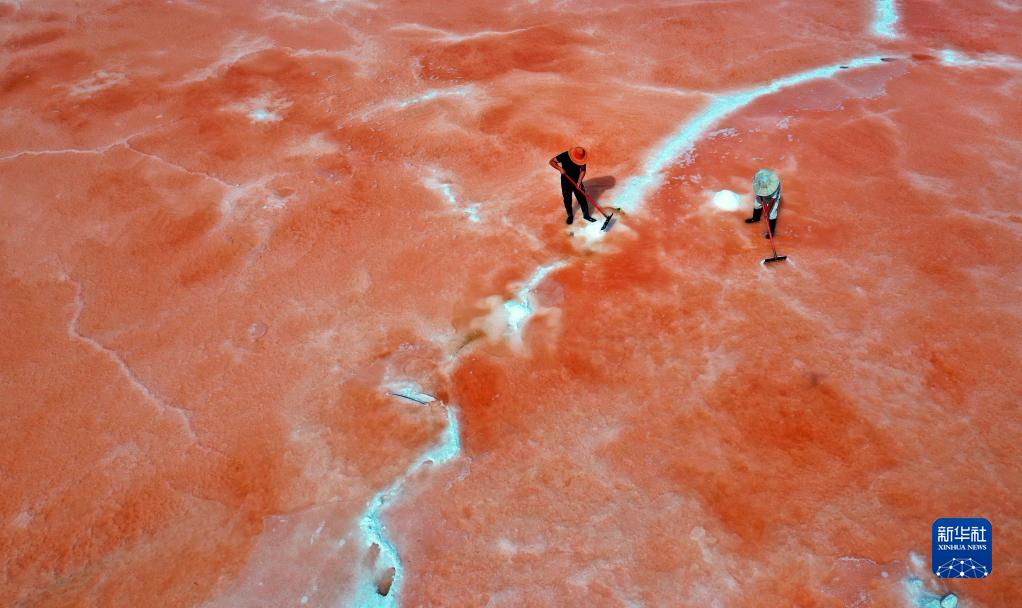 榆林市定边县盐场堡镇盐厂员工在盐池里忙碌(8月7日摄,无人机照片)。榆林市定边县是陕西省的湖盐产区,盐湖群主要分布在一条西南至东北走向的弧线低洼地带。新华社记者 陶明 摄
