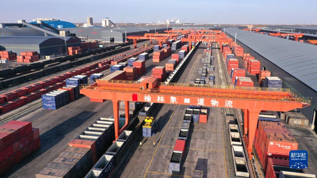 在榆林象道国际物流园集装箱装卸区,工作人员在指挥装卸外运煤炭(2020年10月31日,无人机照片)。该物流园拓宽了陕北能源基地的货物运输渠道,有效破解煤炭外运瓶颈问题,打通了优质煤炭、高端能化、现代农业、先进制造等产业链条。新华社记者 陶明 摄