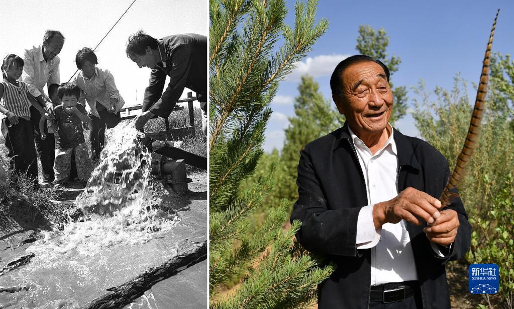 这是一张拼版照片,左图为:1998年7月,榆林市定边县帮助入股治沙的群众在沙地里打出多眼多管井(新华社记者陶明摄);右图为:2020年5月30日,石光银在自己治理的林子里捡到一根野鸡翎。他以联户治沙的方式,带领村民将25万亩沙地变成了绿洲(新华社记者刘潇摄)。几十年来,榆林人民坚持“南治土、北治沙、全域治水”,生态状况呈现出整体好转、局部良性循环的新局面。新华社发