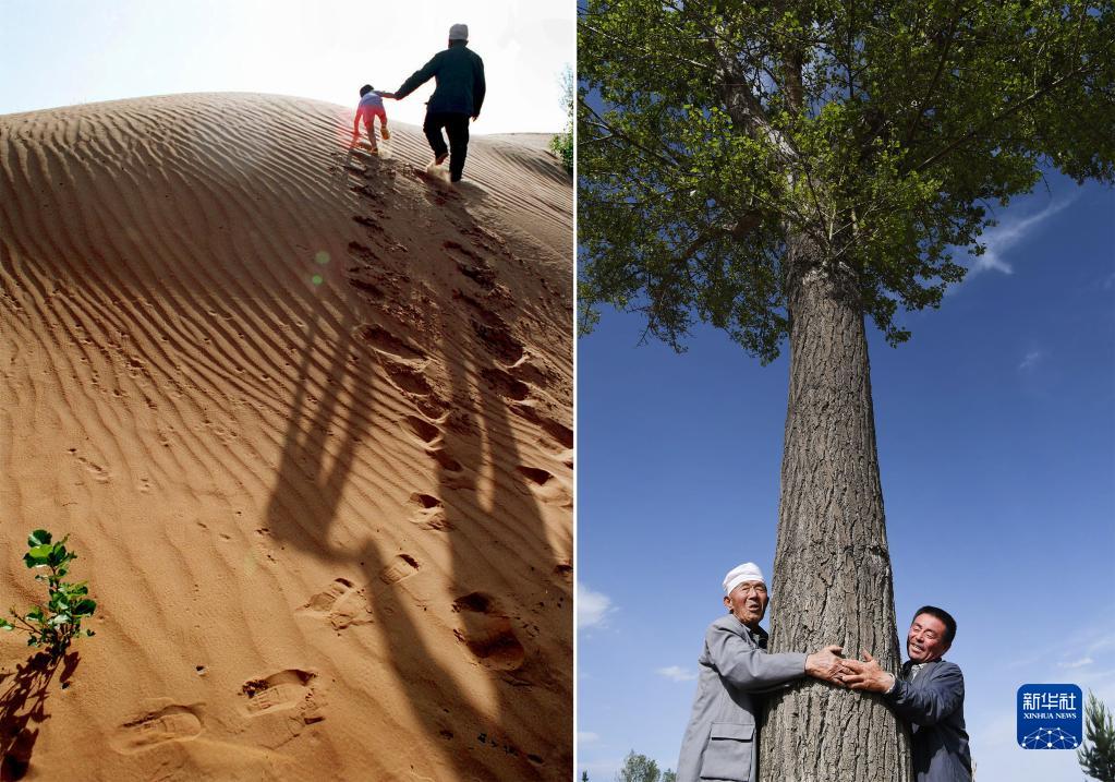 这是一张拼版照片,左图为:1998年8月,榆林市靖边县郭成旺老人带着曾孙行进在沙漠中。老人希望子子孙孙植树造林,直到沙漠都变成绿洲;右图为:2020年5月22日,99岁的郭成旺老人(左)与孙儿郭建军抱着当年栽下的第一棵杨树,向参观者介绍当年植树的情景。1984年,郭成旺承包了离家10公里处的荒沙地,带领全家常年吃住在沙地的简易房里,为4.5万亩沙漠披上了绿装。新华社记者 陶明 摄