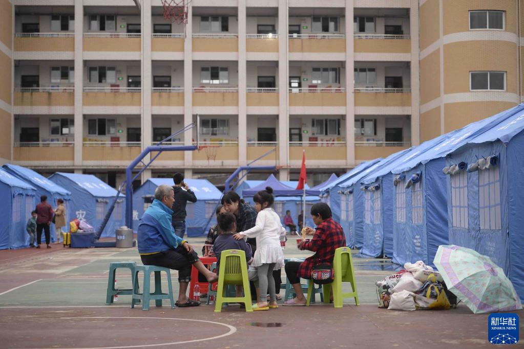 9月16日,受灾群众在泸县嘉明小学安置点内吃饭。