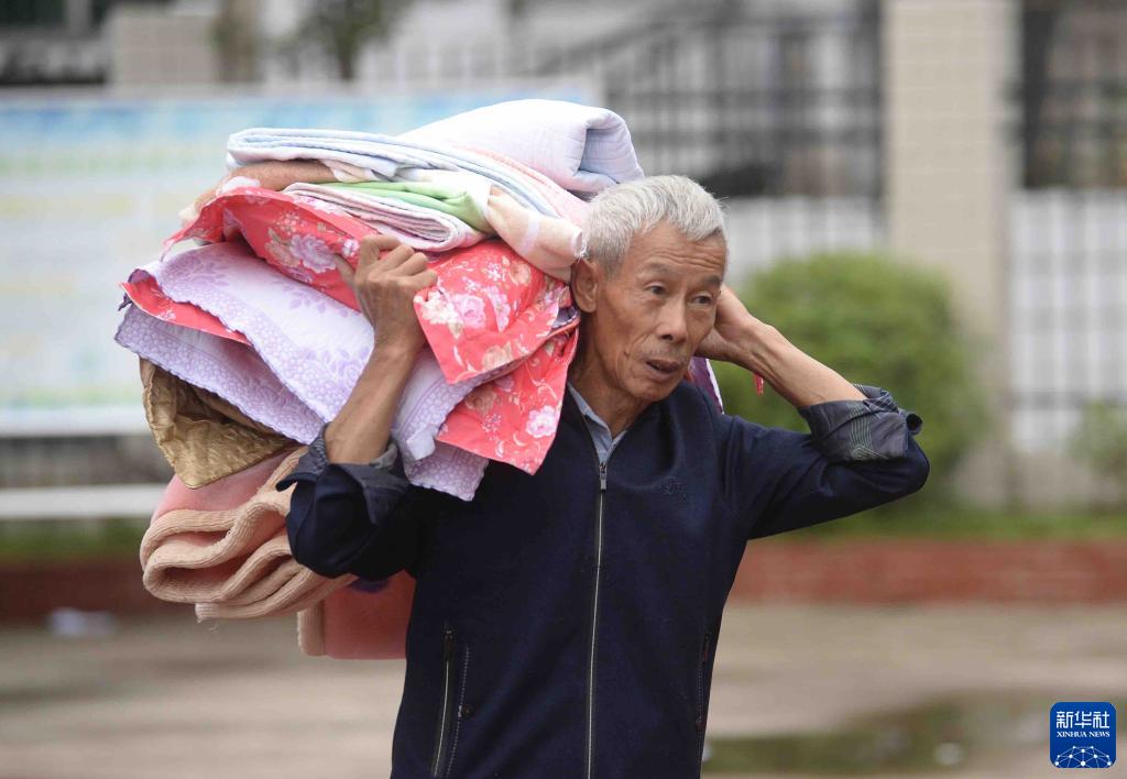 9月16日,受灾群众将生活用品搬进泸县嘉明小学安置点。