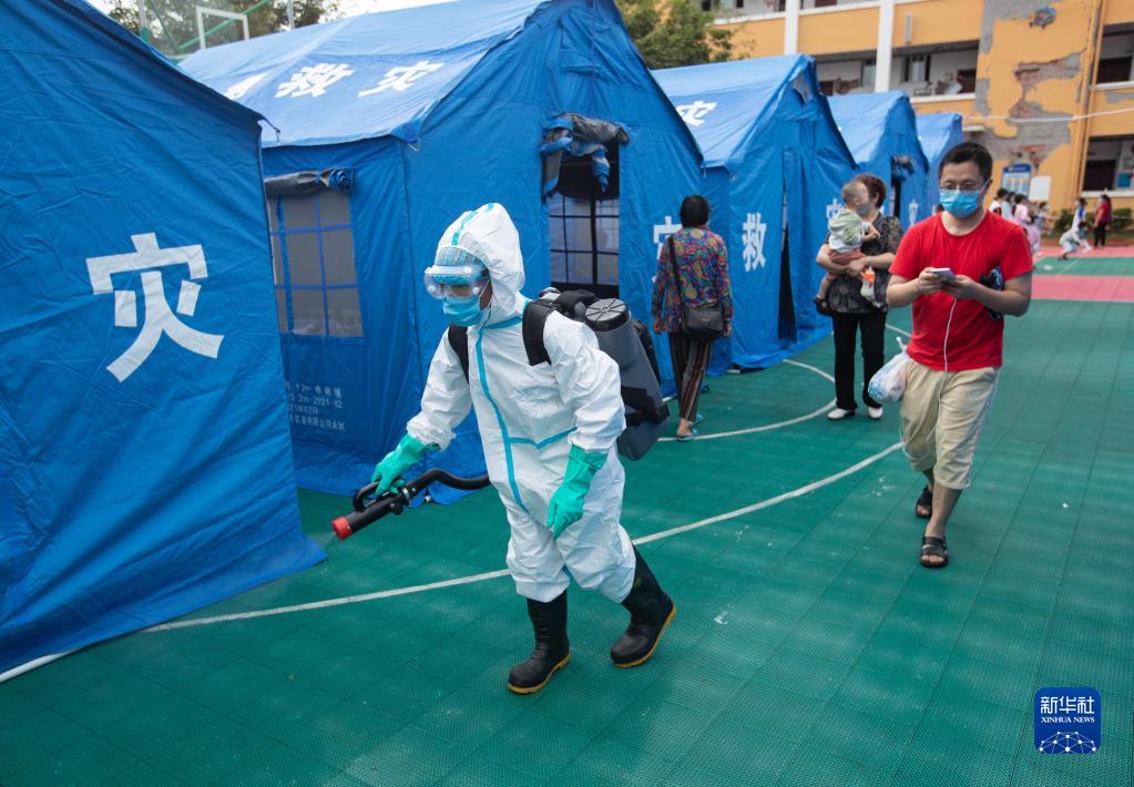 9月16日,防疫人员在泸县福集镇龙脑桥中心校安置点消杀。