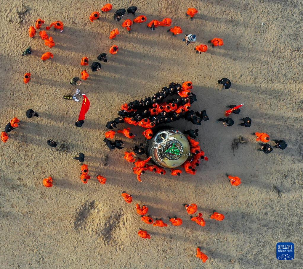 9月17日,工作人员在对返回舱进行处置(无人机照片)。当日,神舟十二号载人飞船返回舱在东风着陆场成功着陆。新华社记者 连振 摄