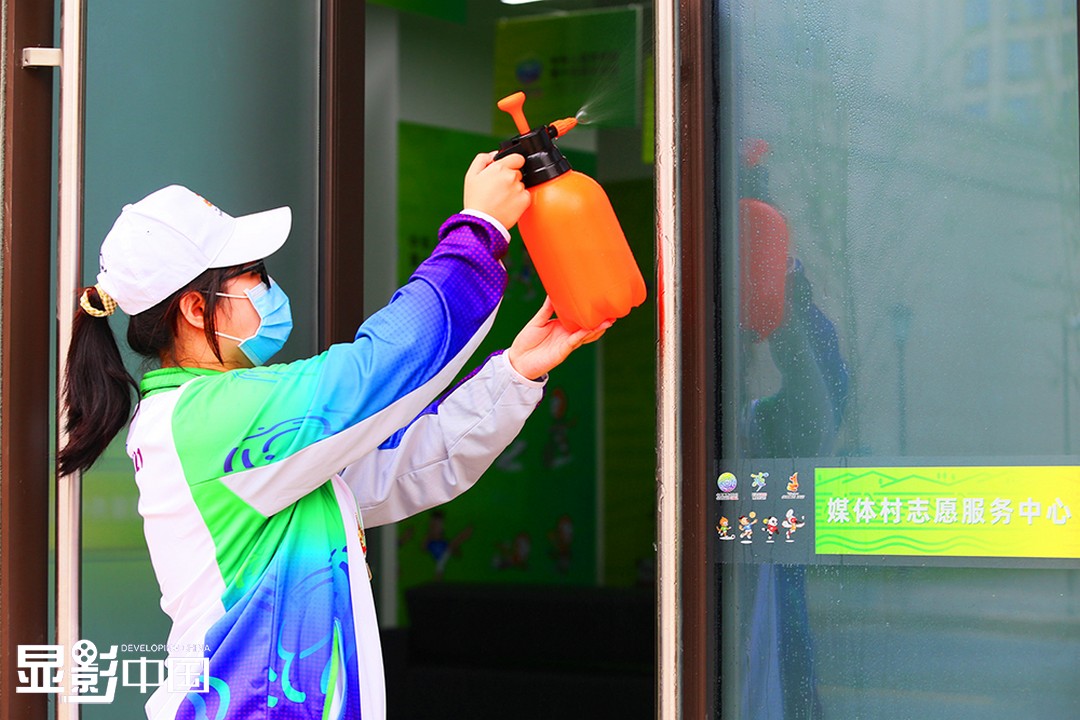 9月16日,在十四运会媒体村志愿服务中心,杨泓用喷壶对服务中心的门框进行消毒。新华网 杨喜龙 摄
