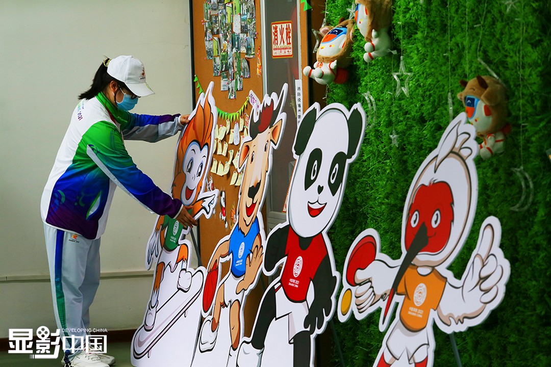 9月16日,在十四运会媒体村志愿服务中心,杨泓整理摆放的十四运会吉祥物形象牌。新华网 杨喜龙 摄