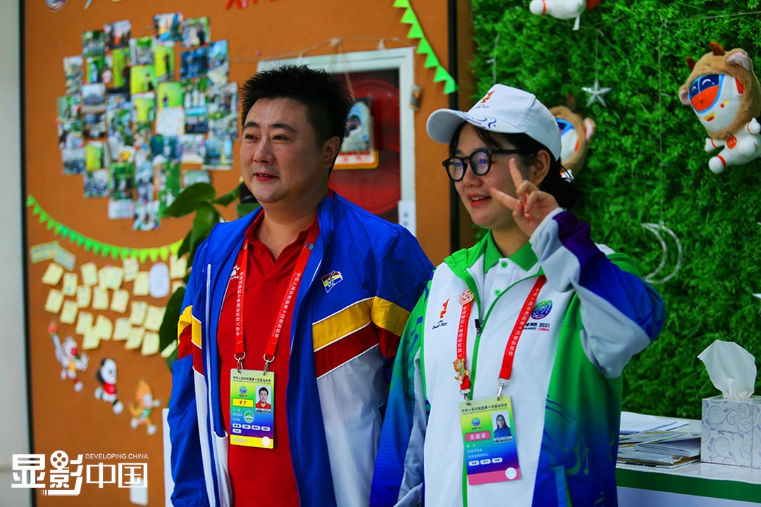 9月17日上午,在十四运会媒体村志愿服务中心,杨泓(右)与一位记者合影留念。新华网 杨喜龙 摄