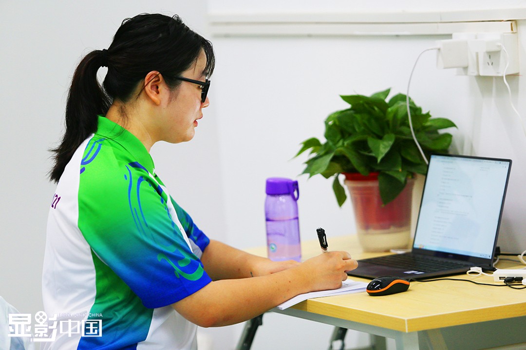 9月17日上午,在十四运会媒体村志愿服务中心,杨泓利用工作休息间隙,上网课完成当日的英语课程。新华网 杨喜龙 摄