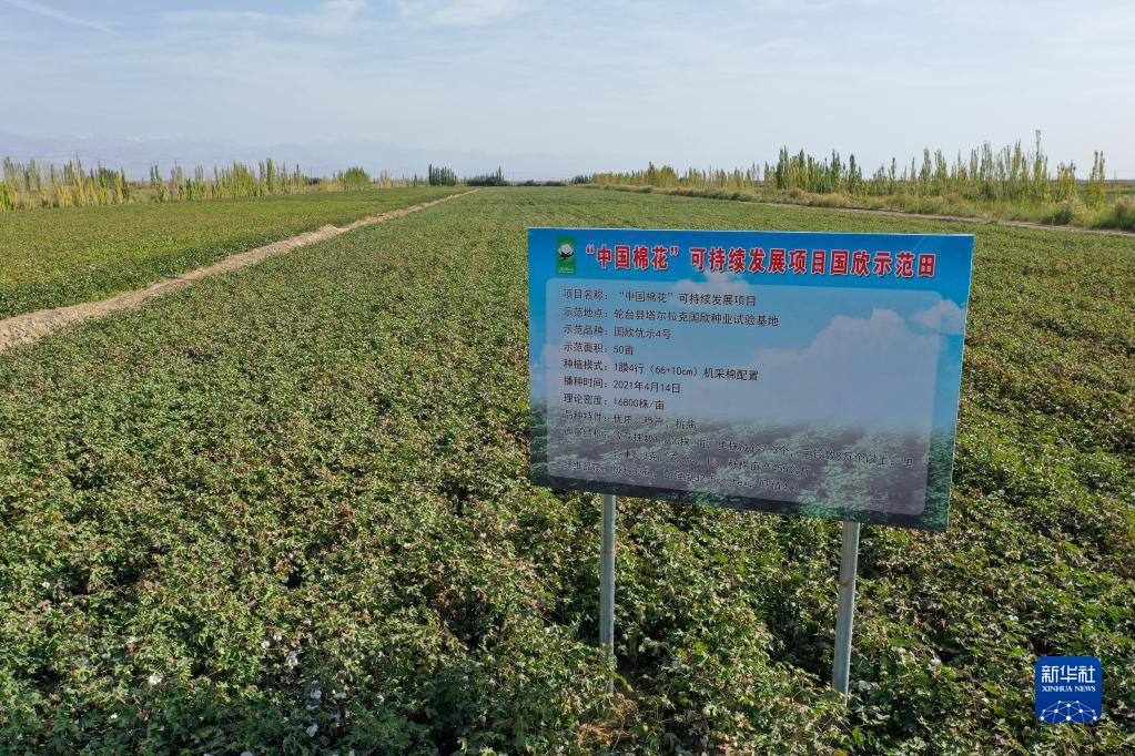 这是9月16日在新疆轮台县塔尔拉克乡拍摄的“中国棉花”可持续发展项目示范田(无人机照片)。