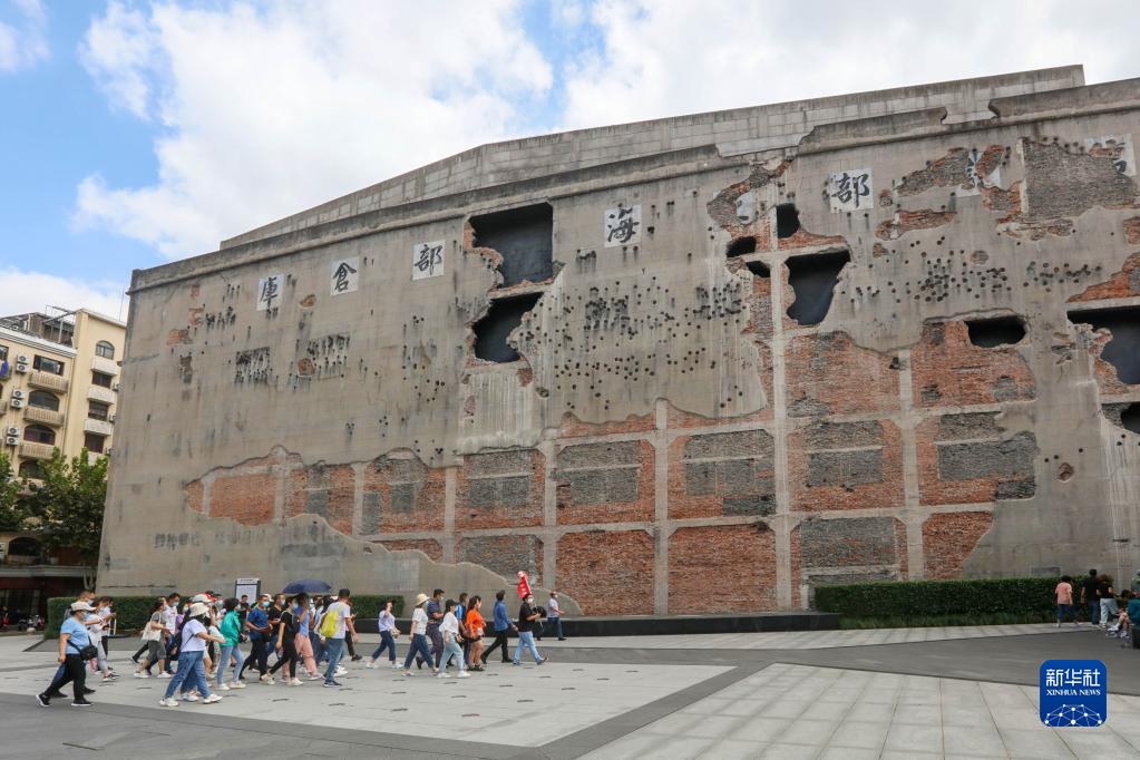 9月17日,人们参观四行仓库西墙的炮弹孔和枪弹孔。