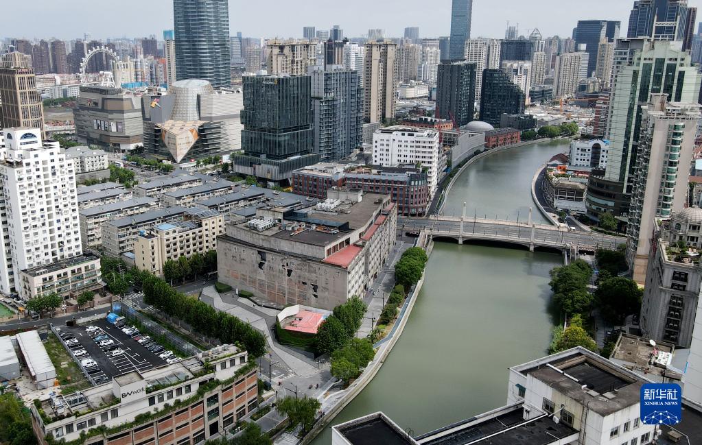 空中俯瞰苏州河北岸的上海四行仓库抗战纪念馆(9月16日摄,无人机照片)。