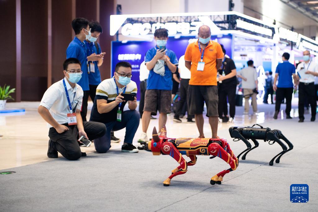 9月17日,观众在长沙国际会议中心围观展示的机器狗、机器牛。