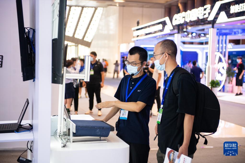 9月17日,工作人员(右二)在长沙国际会议中心向观众介绍智能质检仪。