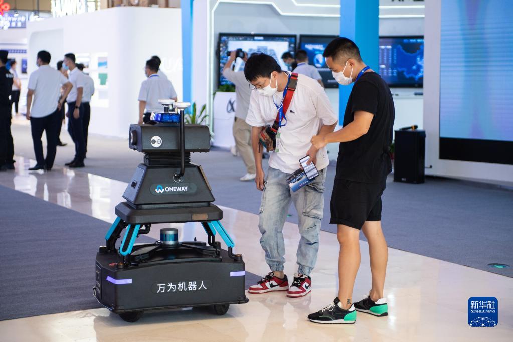 9月17日,观众在长沙国际会议中心与展示的机器人互动。