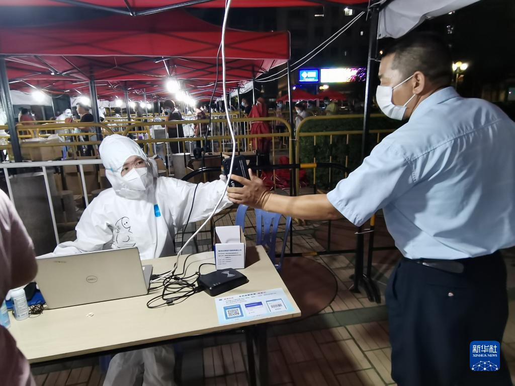 9月16日,在厦门市湖里区金尚小区核酸检测点,厦门市金尚中学教师志愿者在进行人员信息登记。