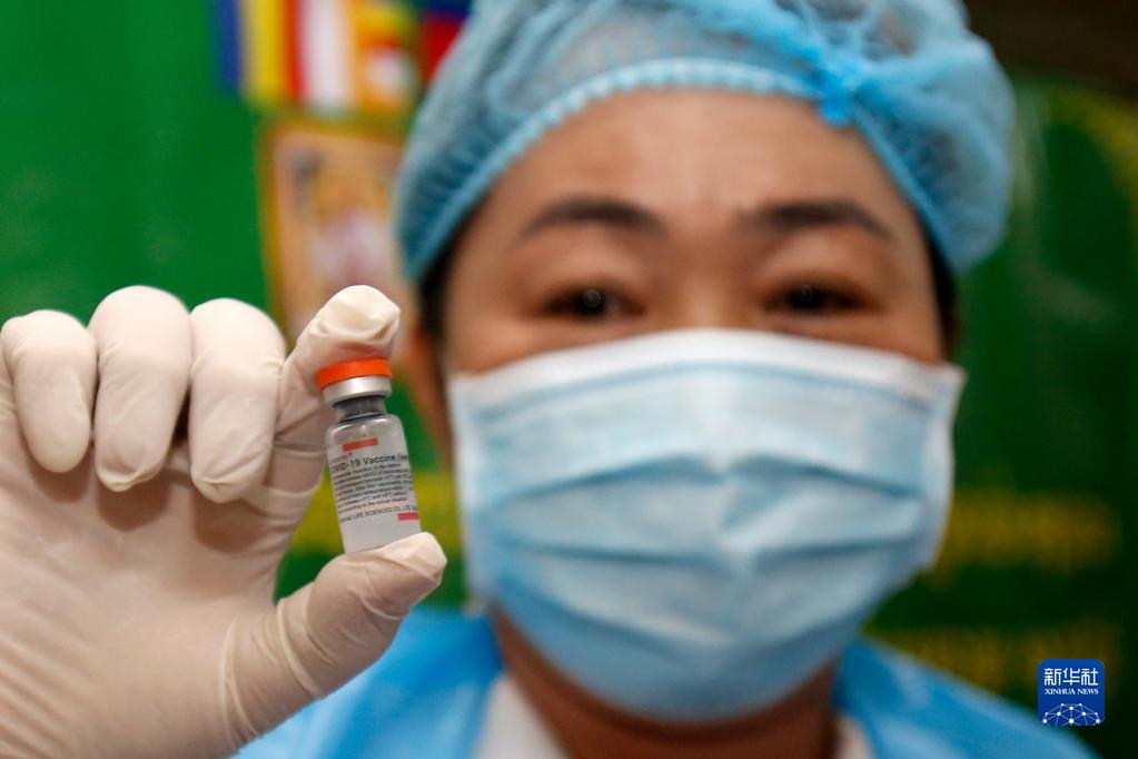 9月17日,在柬埔寨金边,一名护士展示为儿童接种的科兴新冠疫苗。
