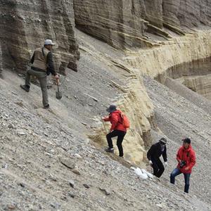 9月7日,在西藏日喀则市一处山体,中科院地理科学与资源研究所客座教授李渝生(左二)和年轻的科考队员分析地质灾害问题。