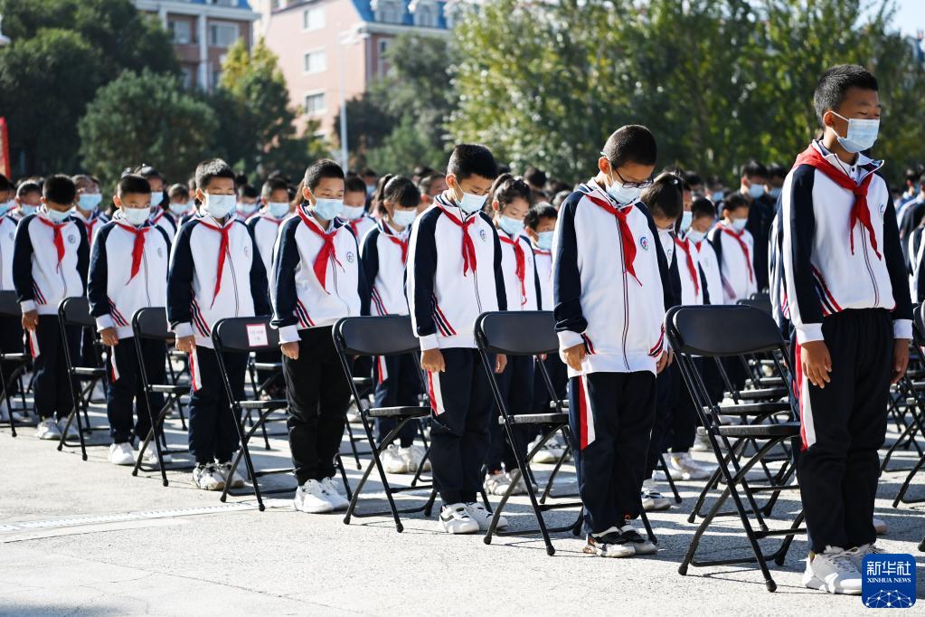 9月18日,在侵华日军第七三一部队罪证陈列馆广场,少先队员在警报声中默哀。